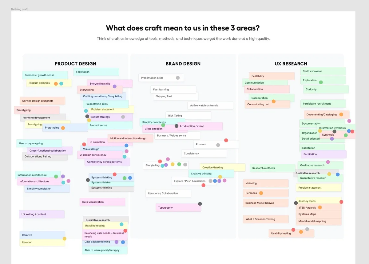 Friday morning Cooldown with @LatticeHQ design team: Defining our craft. Brainstormed areas/skills across brand, product, and UXR → grouped by common themes and narrowed down → ranked where we fell in each area → analyzed distribution across the team!